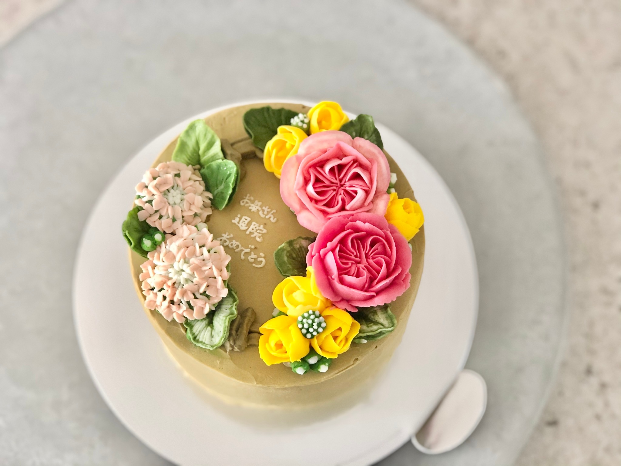 4号(オールバタークリーム)にて、土台はノーマル(ラズベリージャムサンド)デザインはリース春デザインでオーダー下さいました❣️ありがとうございました✨